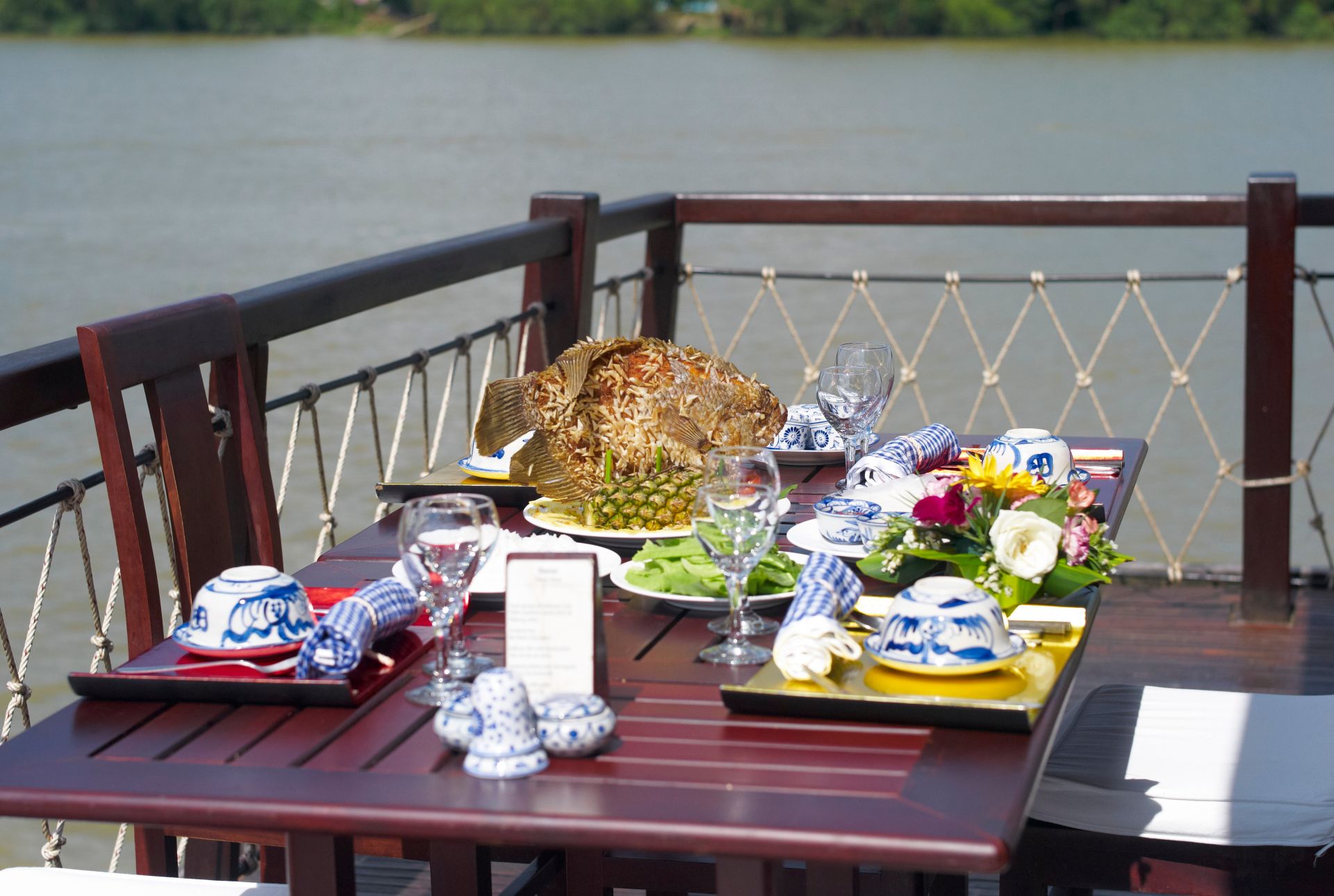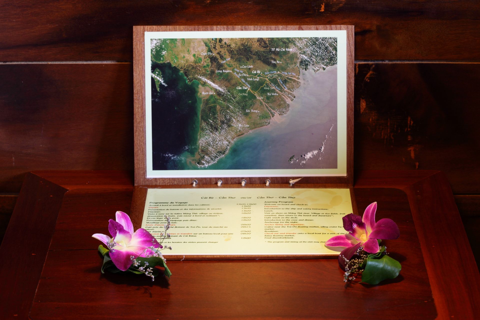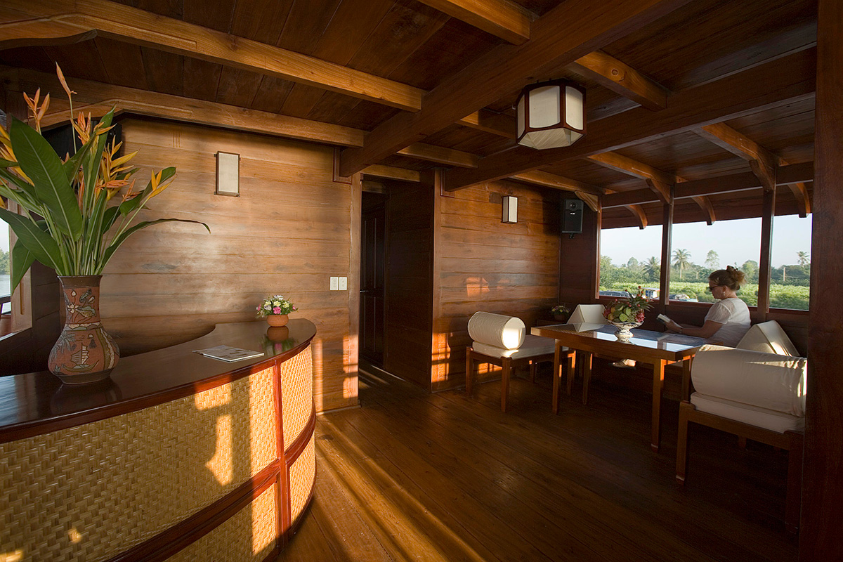- Boarding back, complimentary drink as a welcome back on board. Rest on the deck or around the bar enjoying the sunset.The crew will serve dinner while the Bassac is cruising Mang Thit river.