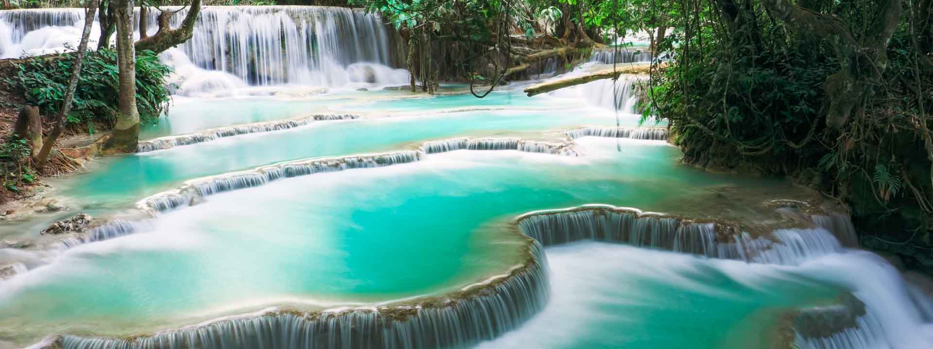 You arrive at the beautiful Kuang Si, which is the biggest waterfall in the Luang Prabang area with three tiers leading to a 50-metre drop into spectacular azure pools before flowing downstream. The pools also make great swimming holes and are very popular with both tourists and locals.
